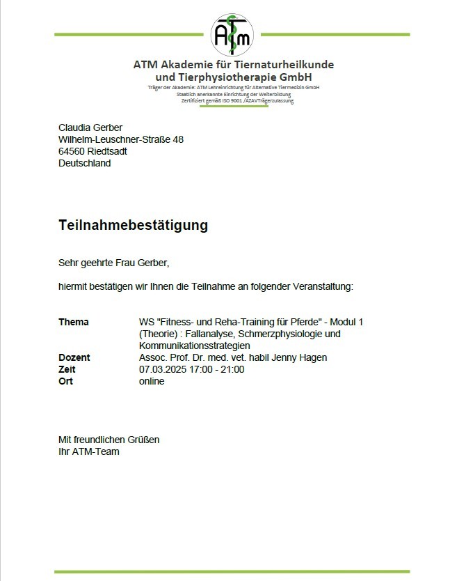 Eine solide Ausbildung ist der Grundstein für alles. Bei der ATM Akademie habe ich eine der besten und umfangreichsten Ausbildungen der Tierphysiotherapie genossen. Kaum durchgeatmet nach erfolgreich abgelegter Prüfung (2021) habe ich den nächsten Schritt gewagt und die Ausbildung zur Tierosteopathin gestartet (bis 2022). Der dritte große Baustein ist das ergänzende Training: 12 Monate Weiterbildung für Longieren als Dialog bei Osteo Dressage (2024/2025) sowie 6 Monate Fitness- und Reha-Training für Pferde bei Assoc. Prof. Dr. med. vet. habil Jenny Hagen (Vet. Med. Institut Leipzig, Dozentin ATM).